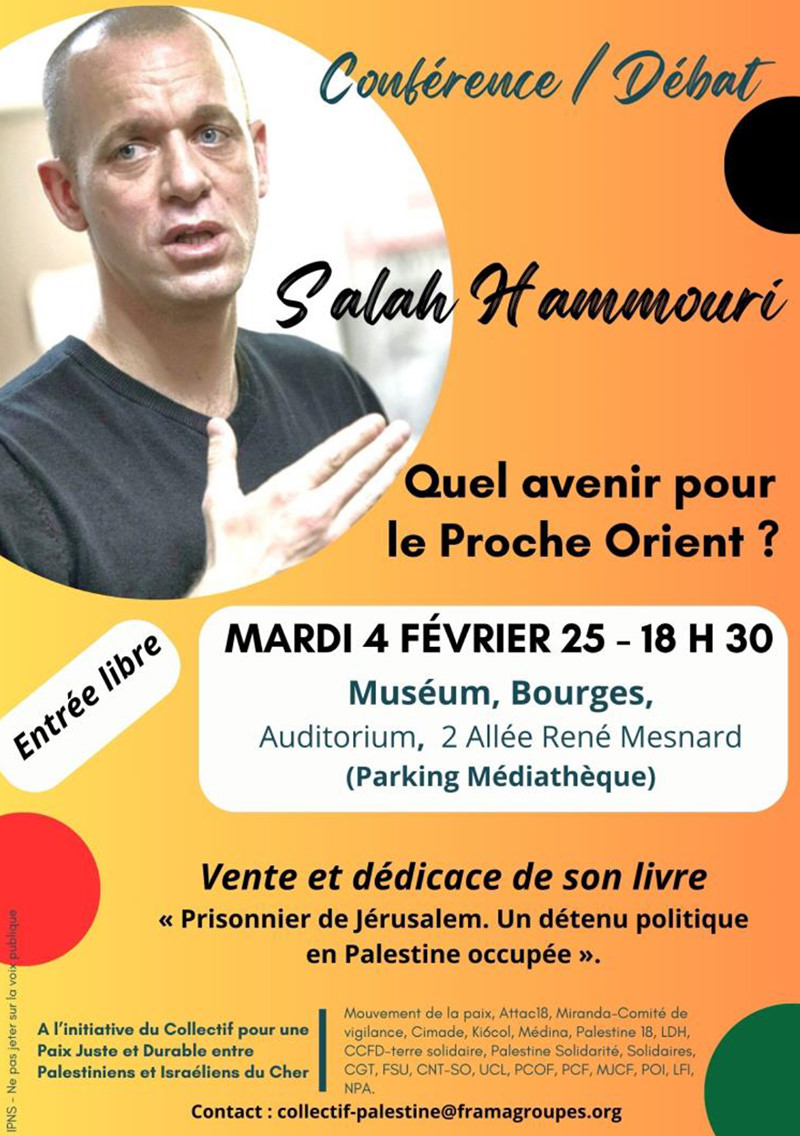 Le collectif du Cher Pour une paix juste et durable organise une conférence avec Salah Hammouri